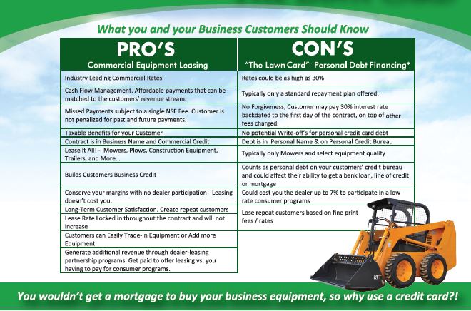 An example of this is in the landscape and property maintenance industry and in particular the spring-and summer-related equipment such as high-cost mowers and trailers that landscape companies purchase to use in their commercial ventures. These types of equipment dealers have options where there are both personal (consumer) and commercial financing options available.